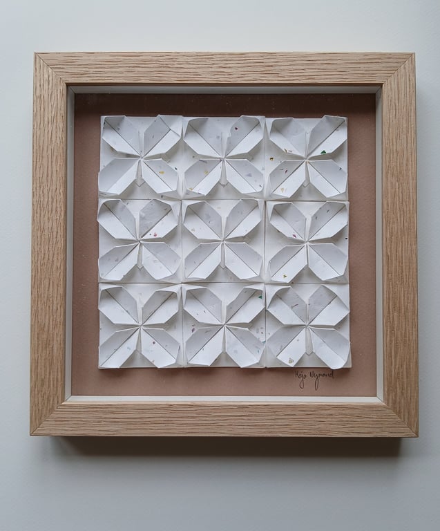 Værket er foldet i håndlavet bomuldspapir i hvid med små farvegnister, på nougat beige baggrund