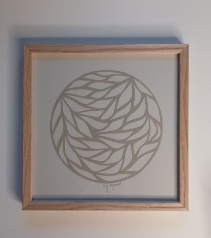 Håndskåret unika papercut20x20cm Beigegrå på meget lys grå baggrund Leveres indrammet I dansk produceret massiv egetræsramme med glas Signeret
