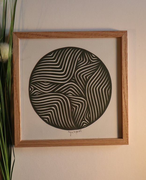 Håndskåret unika papercut Størrelse 20x20cm Skovgrøn på knækket hvid baggrund Leveres indrammet I dansk produceret massiv egetræsramme med glas Signeret
