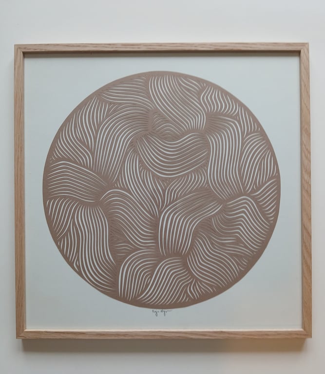 Værket Leveres indrammet I dansk produceret massiv egetræsramme med glas .