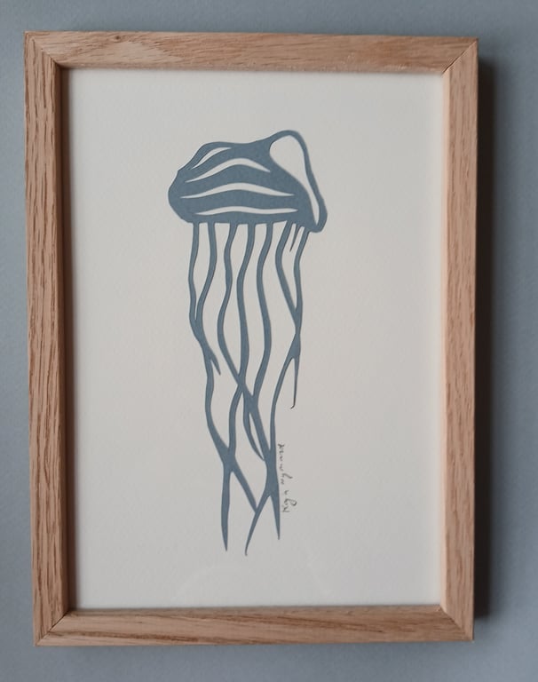 Unika gople nr 111Håndskåret papercut Størrelse A5Dueblå på hvid baggrund Leveres indrammet I dansk produceret massiv egetræsramme med ægte glas Signeret