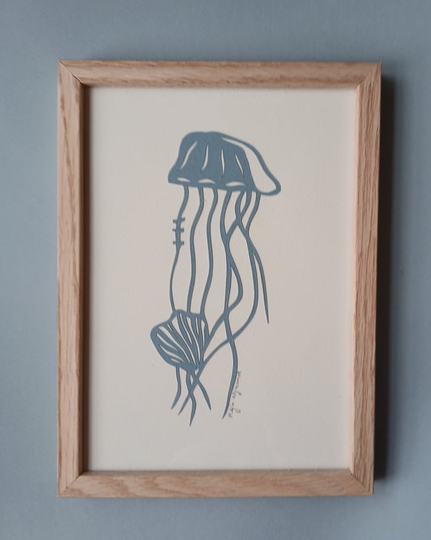 Unika gople nr 114Håndskåret papercut Størrelse A5Dueblå på knækket hvid baggrund Leveres indrammet I dansk produceret massiv egetræsramme med ægte glas Signeret